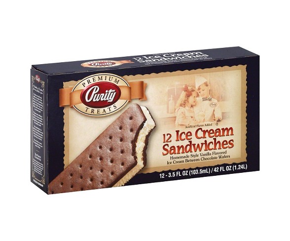 Description Vanilla flavored ice cream between chocolate wafers. Artificial flavor added. A tradition of excellence from our family to yours. Ever since our milk truck rolled out to make its first delivery in 1925, producing products of uncompromising quality and flavor that your family could trust has been our primary goal. We spent years working to develop ice cream treats that could carry on the tradition - exciting flavors, great taste, the best quality around. Our commitment is to continue the tradition into the future. Treats that put smiles on all our faces knowing it's from Purity, it's the best. You see, there's no room for compromise when your name is Purity. The Purity Guarantee: All products bearing the Purity Dairies name are unconditionally guaranteed for quality from the date of purchase until consumed - or your money back. That's the Purity guarantee. Always has been. Always will be. To be sold by carton only.Contains: Milk, eggsStore: In a Frozen location at FrozenForm: SandwichState of Readiness: Prepared, chill and serve, ready to eatPackage type: Individual item multi-servingExterior container material: Paper or cardboardNet weight: 48 ouncesPackage Quantity: 1Vanilla flavored ice cream between chocolate wafers.Artificial flavor added. Estimated shipping dimensions: 8.1INCH X 5.2INCH X 2.9INCH DPCI : 288-07-1864 UPC : 070778821008 TCIN : 47106289 Estimated shippimg weight: 2.625POUND