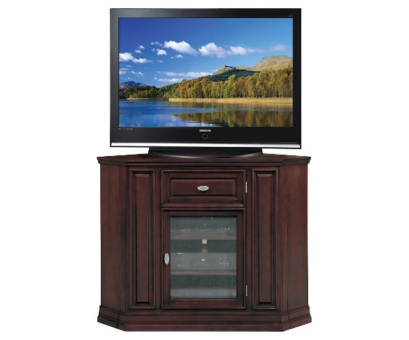Description This 46" wide Corner TV Stand settles your TV back into the corner and reclaims valuable floor space. This console provides a sturdy place to hold popularly sized TV's up to 45" and lifts the screen above visual obstructions in the room. Finished in a hand applied multi-step Chocolate Cherry finish with aged metal ware accents, it is solidly built from solid wood and wood veneers. Multiple components store behind tempered glass and away from dust on three adjustable shelves. Beautifully engineered, this console assembles easily in minutes with its unique folding assembly design.Dimensions (Overall): 36.0 inches (H) x 46.0 inches (W) x 20.0 inches (D)Holds up to: 100.0 poundsMaterial: Hardwood (Frame)Weight: 108.0 poundsMaximum TV Dimensions: 45 inchesCompartment 1 type: ShelfCompartment 1 quantity: 3Holds TV's up to 45 inches36" height lifts TV above obstructions in the roomConstructed of select solid hardwoods and wood veneersHand applied multi-step Chocolate Cherry finish lets the natural beauty of the wood shine throughGlass door construction allows for wireless remote control usage and helps to keep dust off your componentsBeveled glass doors allow for easy remote control accessQuick assembly in minutes Estimated shipping dimensions: 38.0INCH X 9.0INCH X 50.0INCH DPCI : 249-10-0680 UPC : 893317000647 TCIN : 49119614 Estimated shippimg weight: 108.0POUND