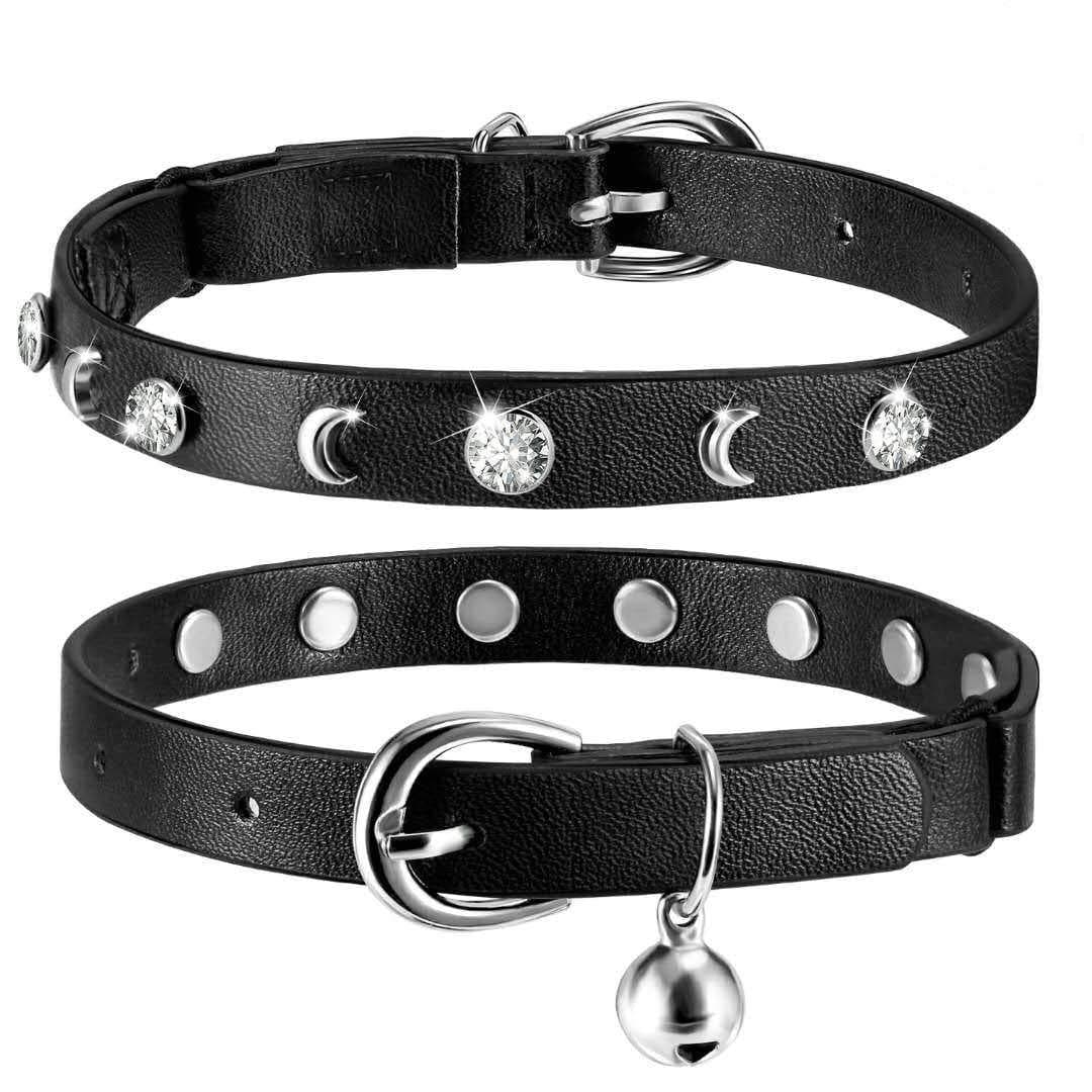 The plastic rhinestones aren't very sparkly at all - manufacturer may as well swap them for flat stars like how the moons are made, but I wasn't expecting Swarovskis lol so w/e. The quality of the PU leather is nice - not too stiff around a cat's neck, and has rubber binding on the edges instead of stitching, which I like. Also, you can tuck the tail end into the opening where the elastic is, which is a cleaner look than having a loop to hold the end, and doesn't get in a cat's way when they roll over. Looks really good with the tiny natural stone moon and star charms I got and put on all my cats' collars.