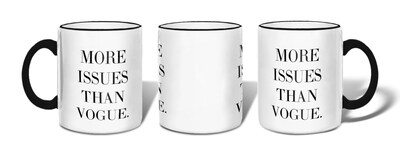 Description Retrospect Group MORE ISSUES THAN VOGUE Ceramic 11 Ounce Mug (MUG005) is dishwasher safe and Prop 65 compliant. The black handle and black rim give this mug a uniquely modern look. Any of our witty and artful 11 oz. ceramic mugs will make a fantastic companion for your desk or kitchen. Also makes for a fun gift for those creative and wordy people in your life! With stark black text over gleaming white ceramic, this collection makes a great impression at every party. White Mug; Black Rim; Black Handle 11 Ounce Mug Dishwasher Safe Prop 65 Compliant Specifications Brand : Retrospect Group Customizable : No Weight : 0.80 lbs. per Each