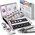 The RATEL Metallic Watercolour Paint Set features 12 premium, non-toxic solid pigments delivering vivid, glittering metallic colors. Designed for both beginners and art lovers, it includes 2 brushes and a color card in a compact box for easy portability. These high-pigment paints offer excellent permanence, fast drying, and smooth blending, making them ideal for creating shimmering artworks on any watercolor paper.