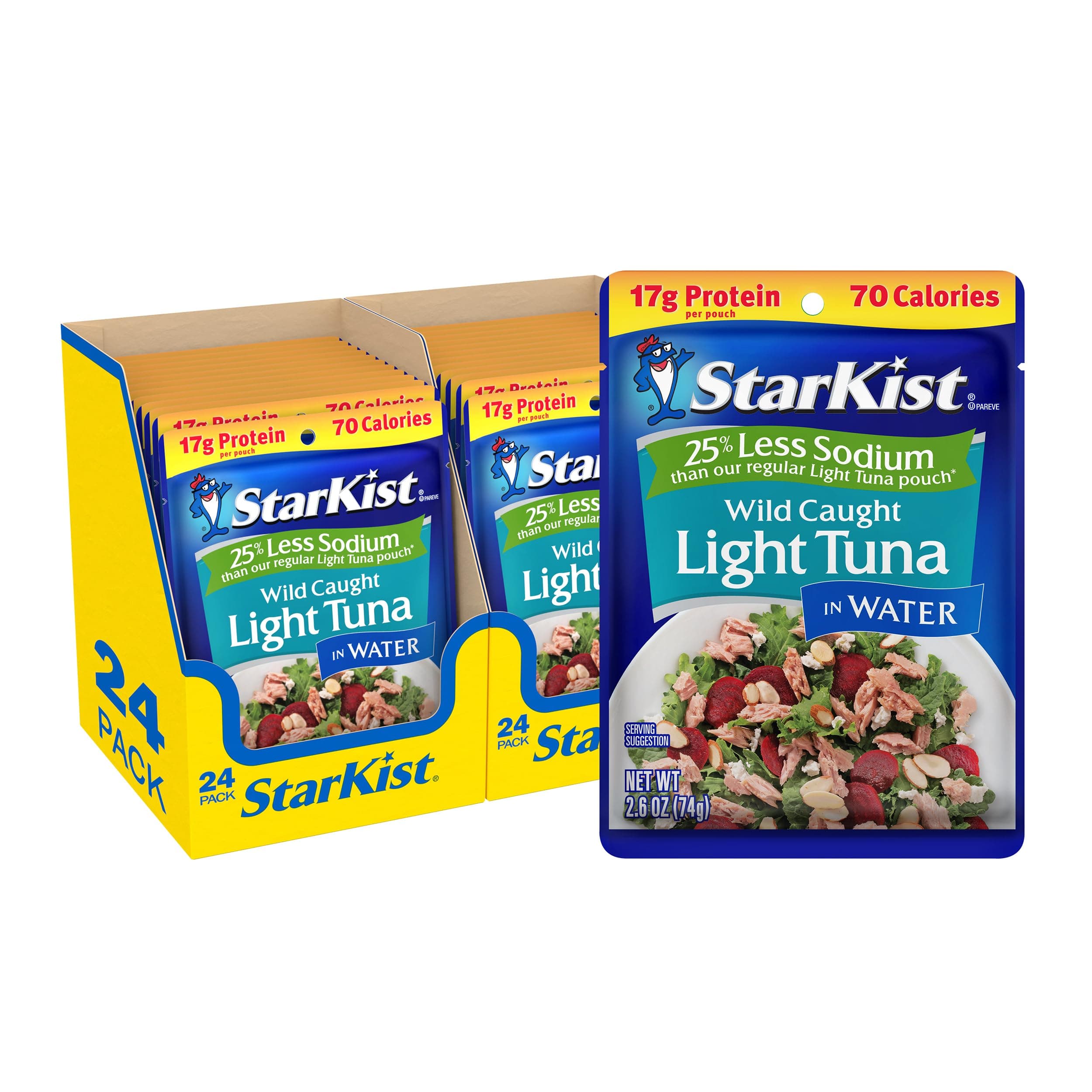 StarKist Reduced Sodium Chunk Light Tuna in Water delivers 17g of protein and only 150mg sodium per 2.6 oz pouch. Wild caught and dolphin safe, this gluten-free, soy-free tuna is perfect for keto, paleo, and Mediterranean diets. The convenient, no-can pouch preserves freshness and is ideal for quick meals or snacks. Available in a 24-pack, it’s a smart, healthy staple for busy professionals seeking clean, flavorful nutrition on the go.