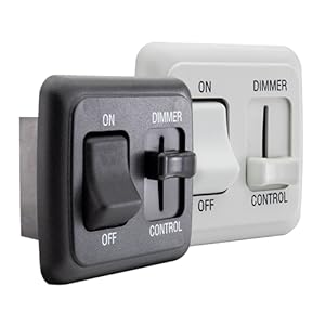 The RecPro RV Dimmer Switch is a 12V DC high-side dimmer designed for versatile lighting control in RVs. Featuring a smooth sliding dimmer and ON/OFF toggle, it supports LED, incandescent, and halogen bulbs. Built with durable plastic composite and proudly made in America, this switch offers reliable performance and a sleek white finish to complement any RV interior.