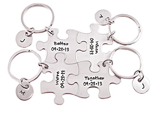This listing includes four 1" x 1 1/2" hand stamped stainless steel puzzle piece key chains. Stamped as shown in sample photo "Better When We're Together with date and personalized initial on each piece.