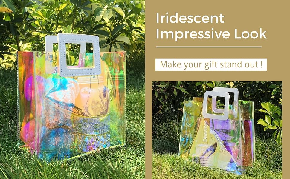 The VUOJUR Holographic Small Gift Bag is a stylish, reusable 8.3x8x4'' iridescent bag featuring a durable vegan leather handle. Perfect for birthdays, weddings, and bachelorette parties, it elevates gift presentation with a holographic finish that highlights your gift’s colors while offering sturdy, eco-friendly reuse.
