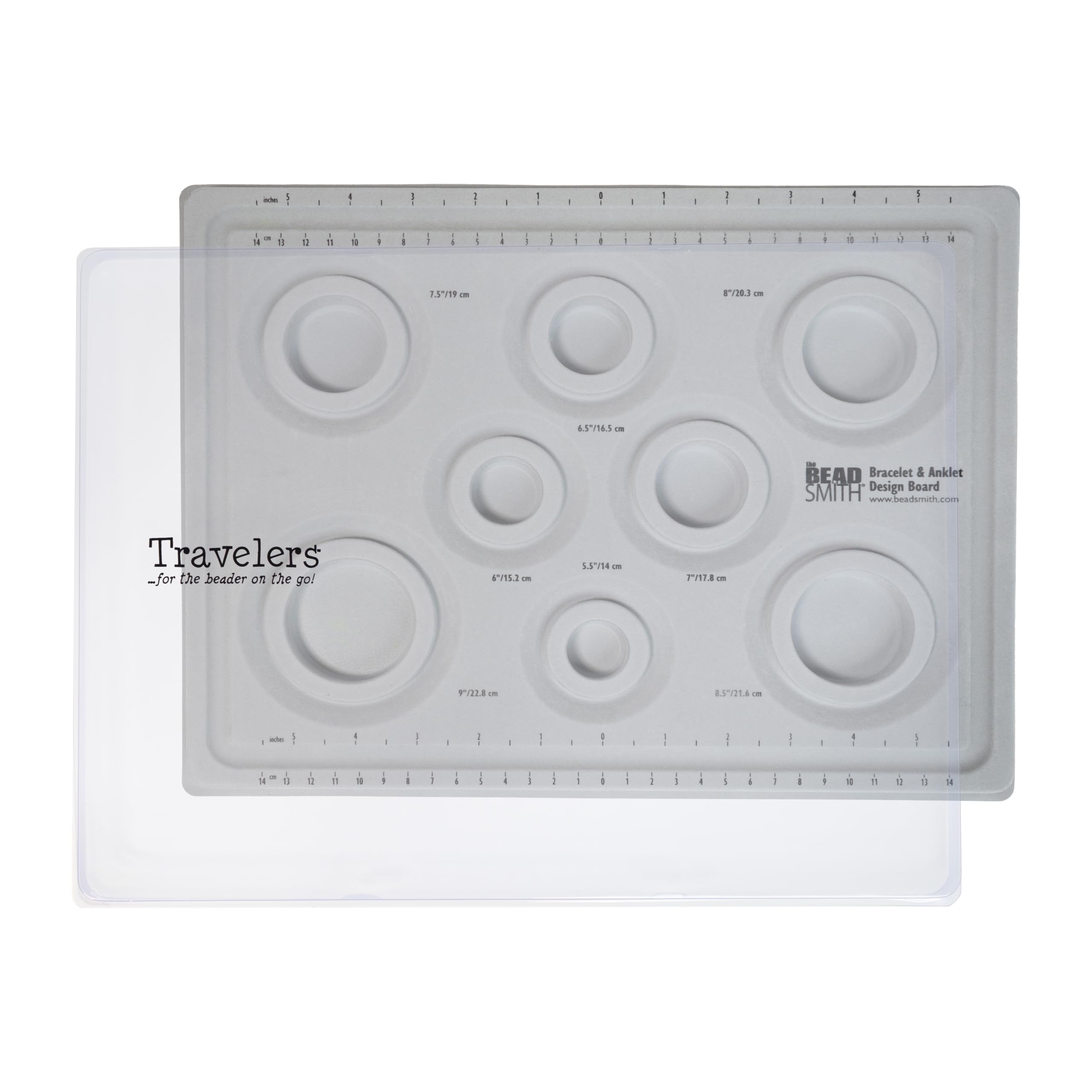 The Beadsmith Elements Bead Board is a 10.75 x 13.75 inch jewelry design station featuring 8 graduated circular channels (5.5" to 9"), a flocked surface to prevent bead movement, 8 recessed compartments for components, a printed ruler in inches and centimeters, and a removable transparent cover for secure transport. Trusted by professionals and hobbyists, it streamlines bracelet and anklet creation with precision and portability.