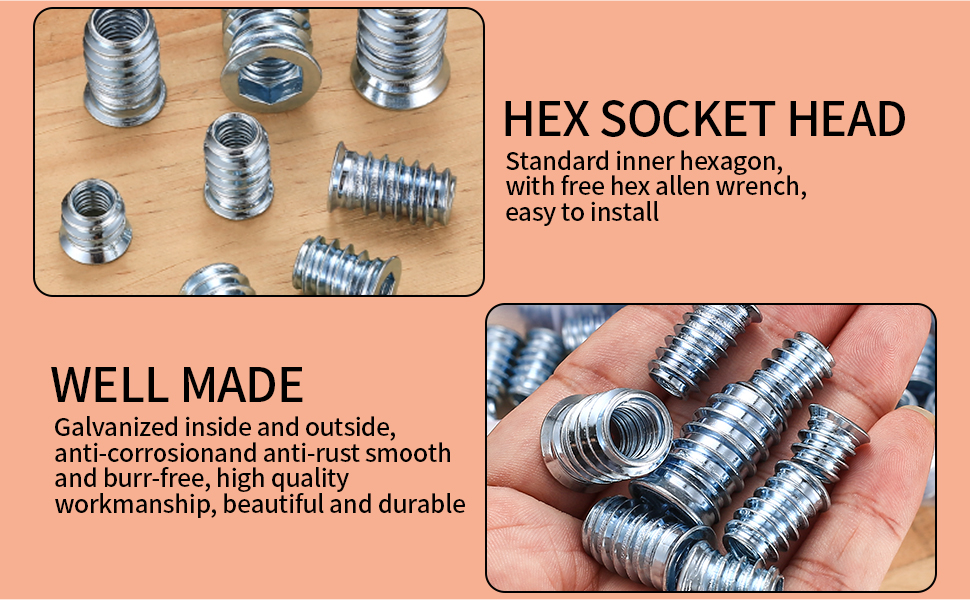 The Gaomoeny100 Threaded Inserts Kit offers 100 high-quality carbon steel inserts in assorted M6, M8, and M10 sizes, featuring rust-resistant blue and white zinc plating. Designed with a hex socket drive and flanged exterior threads, these inserts provide secure, durable fastening for softwood furniture assembly. Packaged in a convenient storage box, this kit is a must-have for professionals and DIYers seeking reliable, long-lasting wood joinery solutions.