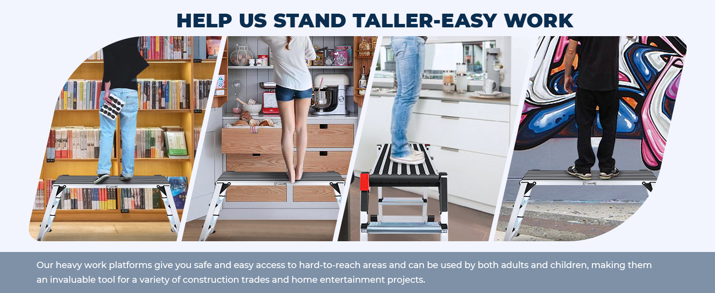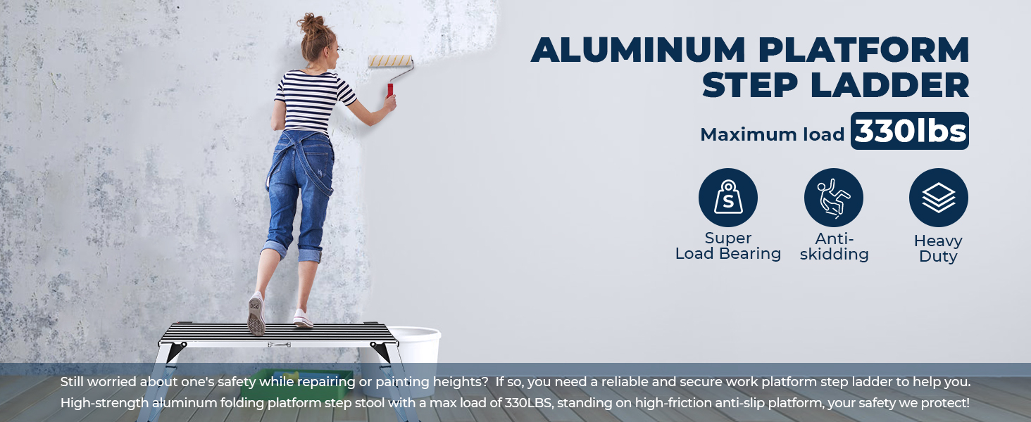 This 50"×12"×27" aluminum two-step work platform combines heavy-duty durability with smart foldability, supporting up to 330 lbs. Featuring dual-sided wide steps, secure metal safety locks, and anti-slip surfaces, it ensures maximum stability and safety for a variety of professional and home tasks.