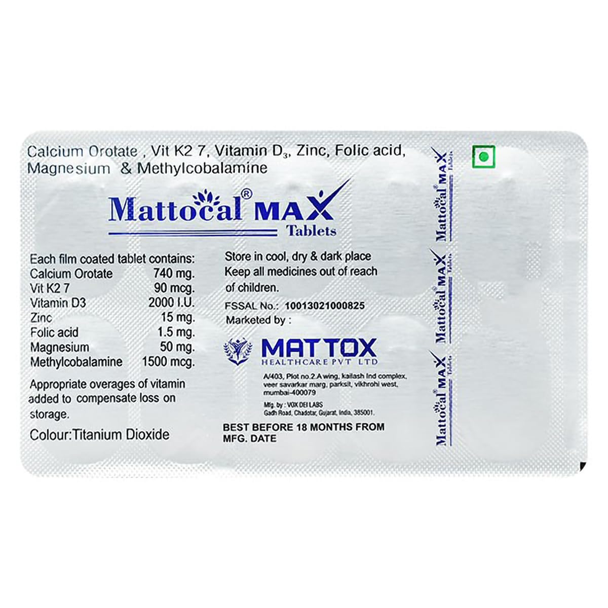 Mattocal Max is a powerful dietary supplement strip containing a precise blend of essential vitamins and minerals, including Calcium, Vitamin D, Magnesium, and Zinc, designed to support overall health and wellness. Each strip contains 10 tablets, ensuring you have a convenient and effective way to meet your nutritional needs.