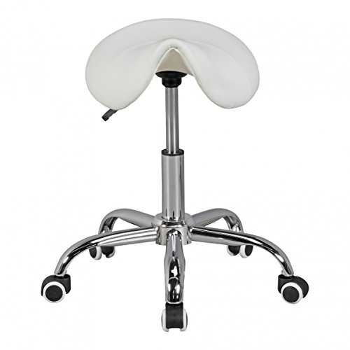 design • Very stable and extra comfortable stool • White faux leather seat in saddle shape • Robust swivel stool with sturdy aluminum foot cross Colour • Cover seat base: White • Frame: Silver particularities • Stool is adjustable in height by the lever on the seat bottom 12 cm • Seat is rotated through 360 ° • Recommended maximum loading capacity up to 100kg • Role stool with black - white fitted carpet rolls • Free movement of the legs ensures saddle shape material • Seat: Synthetic Leather • Frame: metal textile composition • Reference seat 100% polyurethane Dimensions • Height: 48 - 60 cm • Star base diameter: 60 cm • Seat (BxT): 38 x 35 cm delivery • 1 saddle stool • Delivery without decoration