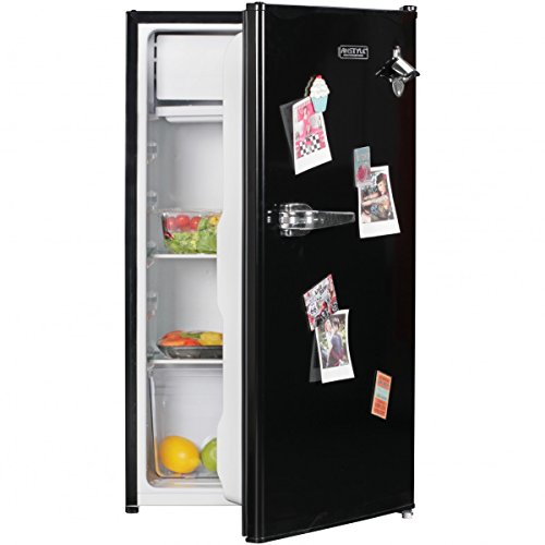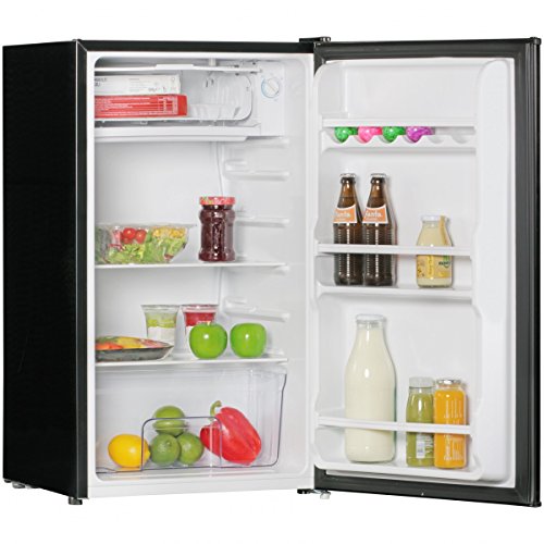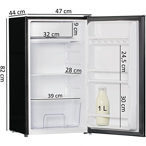 design • Design fridge in the hip retro look • Mini fridge with bottle opener on the door External dimensions: • WxHxD: 47 x 82 x 44 cm Internal dimensions: • See dimensional drawing • Shelves in five different heights at a distance of 7/8 cm Colour • black particularities • Refrigerator with integrated freezer • Bottle opener on the door • Stepless temperature control from 0 to 10 ° C Technical specifications • Net capacity: 91 liters • Energy efficiency class: A + • Energy consumption: 110kWh / year • Airborne emissions: 39dB (A) delivery • A fridge without decoration and food Assembly • Delivery condition: assembled The energy efficiency scale ranges from A ++ (low consumption) to G (high consumption). Energy consumption kWh / year 110 Energy consumption in kWh / year based on results of the standard test over 24 h. Actual energy consumption depends on the use and location of the appliance Net capacity of the refrigerator compartment (l) 46 Net capacity of the refrigerator compartment (0 ° C) in liters Net volume of the freezer compartment (l) 0 Net capacity of the freezer compartment in liters Star rating of the freezer compartment (number of stars) 1 Star labeling for the freezer: 1 star = -6 ° C suitable for short-term storage of frozen food (about 1 week) 2 stars = -12 ° C suitable for medium-term lag of frozen food (about 2 weeks) 3 stars = - 18 ° C suitable for frozen food storage 4 stars = -18 ° C Climate class ka SN: Ambient temperature 10 ° C 3
