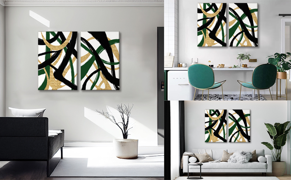 This set of two 12x16 inch abstract stripe canvas prints features premium quality artwork on solid wood frames with pre-installed hooks for easy hanging. The modern minimalist design in green, gold, and black geometric patterns adds a sophisticated touch to living rooms, bedrooms, offices, or any space needing a stylish upgrade.