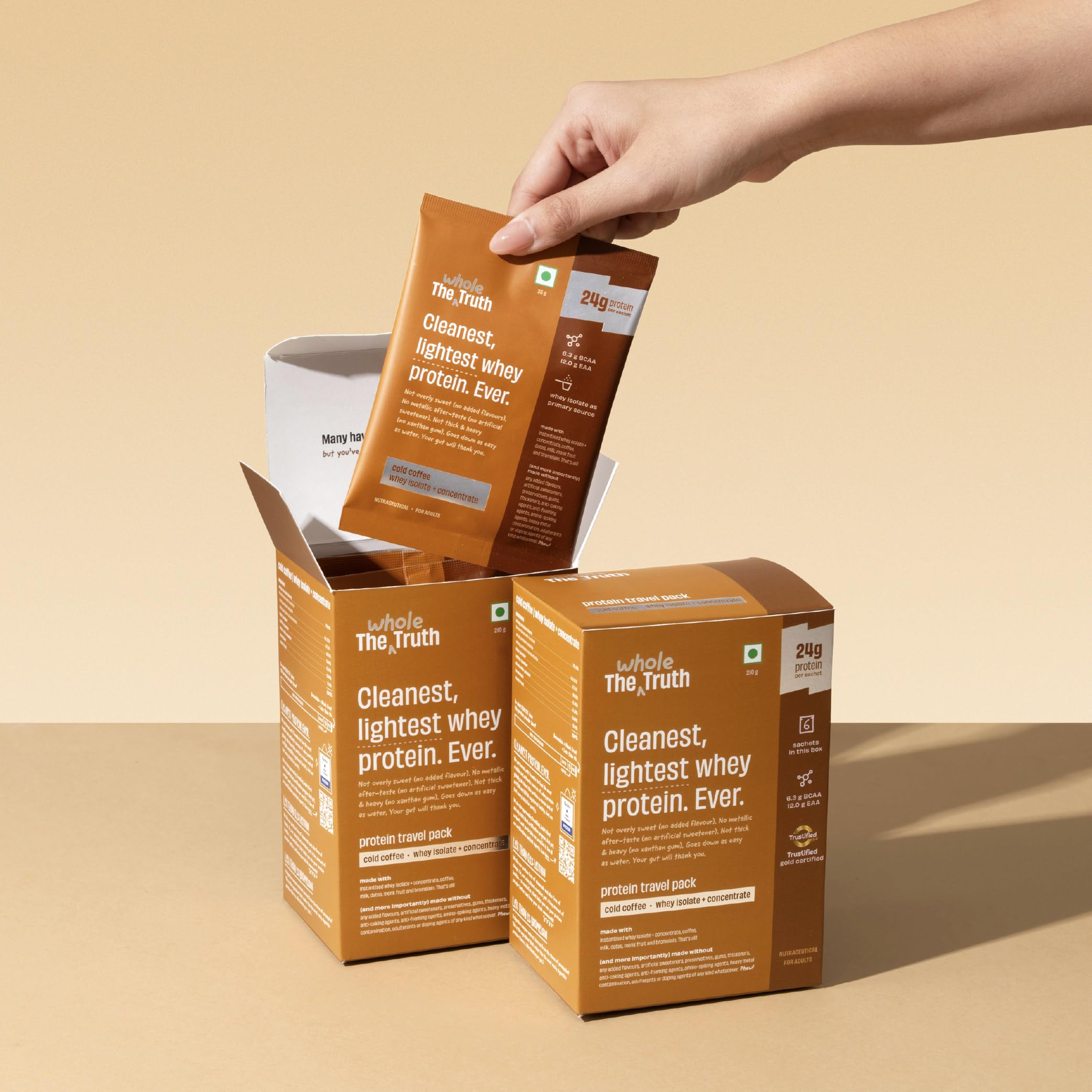 The Whole Truth Whey Protein Isolate+Concentrate Cold Coffee 210g (Pack of 6) delivers 24g of high-quality protein and 6.4g BCAA per sachet in a clean, gut-friendly formula. Made with real coffee and natural ingredients, it contains no artificial sweeteners or preservatives. Sourced from Ireland’s leading whey producers and manufactured in certified facilities, this protein powder offers a pure, delicious, and convenient solution for professionals on the move.