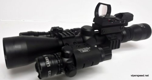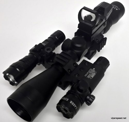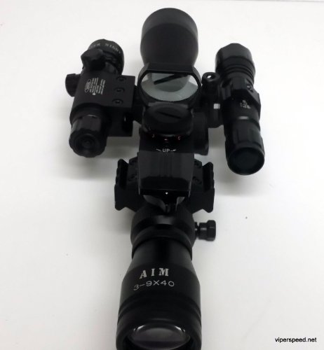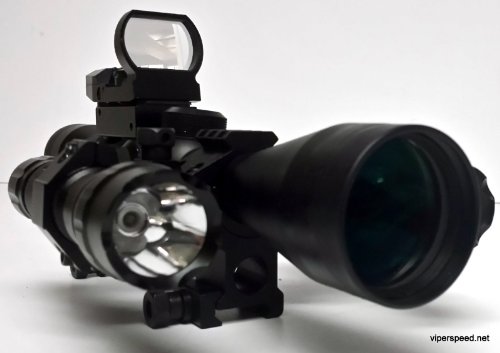 This scope combination is designed to be your ultimate hunting tool and zombie weapon accessory. It features the best of everything. The base is the rugged and reliable 3-9x40 with a P4 sniper reticle with range finder. We then added our most reliable red dot sight Also added the well known WF-501b tactical light and finally our high intensity Red target acquisition laser And to keep it all together we included 2 heavy duty scope rings