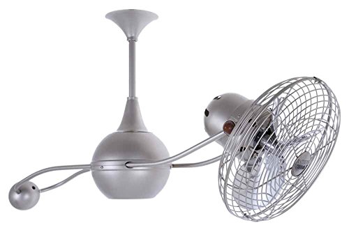 Comes standard with 20 inch downrod. Down rods can be easily field cut. Motor heads can be infinitely positioned in 180 degree arcs for optimum air movement. 13 in. metal blades with safety and decorative guards. Safety cages can be used on lower ceiling heights. 60 degree optimum fan head position. Regulated by variable speed wall controls. Metal bladed fans with protective powder and clear coated are suitable for damp location. Unique motor mount and fan head knob is genuine marbleized bakelite. Handmade. UL listed. Voltage: 110. Warranty: Limited lifetime. Made from cast aluminum, heavy gauge spun and stamped steel. Canopy: 5.5 in. Dia.. 39 in. W x 7 in. H (21 lbs.) The Brisa 2000 is our most unique rotational ceiling fan. Like satellites orbiting a planet, the Brisa's select mahogany blades and lunar counterweight gently orbit about its spherical gear housing. The greater the angle of the motor to the horizontal support rods (up or down), the faster the axial rotation. A slow, controlled axial rotation is achieved by both motor head position and fan blade speed. Increasing angles of fan heads to support poles increases speed of axial rotation.