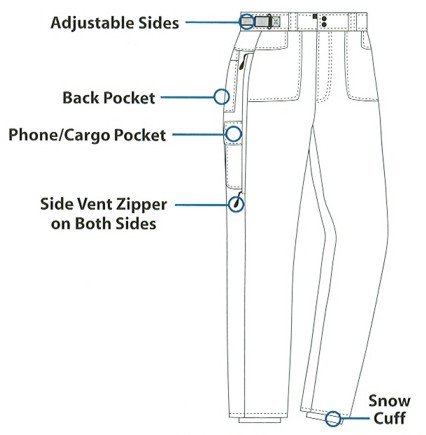 Insulated ski and snowboarding pant with adjustable side tab, cargo pockets, side vents and snow cuff.