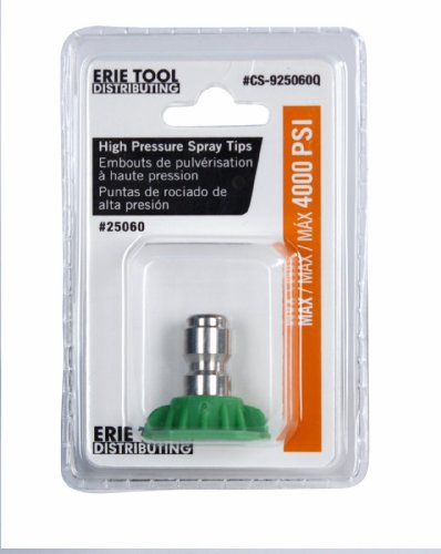 ETD 1/4" Stainless Steel 4000 PSI Quick Connect High Pressure Spray Tip 25 Degree Nozzle 4.0 Orifice SizeETD 1/4" Stainless Steel 4000 PSI Quick Connect 25 Degree Nozzle 4.0 Orifice 25° Nozzle High Pressure Flushing Tip Nozzle4000 PSI1/4" Stainless Steel Insert4.0 Nozzle Orifice SizeMost common nozzle for general cleaning applicationsThrough hardened stainless steel orifices offer superior wear resistance Stainless Steel hosing resists cracking and wear Resistant to most chemicals Laser Marked for clarity and durability Large color coded on Quick Connect Nozzles permits rapid identification of spray angle25° Nozzles Best Used For:General cleaning of dirt, mud and grimeCleaning roofs, gutters and downspoutsRemoving light mildew stainsRemoving algae and bacteria build-up from poolsRinsing surfaces in preparation for paintingCleaning siding, sidewalks & outside furniture
