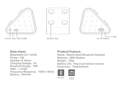 Mini Wireless Portable Bluetooth Speaker Outstanding place Music Player and Phone Stand ,sucker at the bottom of the speaker. strong attraction, steady your iphone and ipad, it can solve all inconvenient when you're watching the moive or listen music, the comfortable angle let you enjoy and do not feel tired Big performance Powerful sound, you will be feel so amazing that the powerful sound come from such a small speaker. Not only that, it built-in 500 mAh rechargeable lithium battery, playtime about 5 hours. Bluetooth Extreme sensitive bluetooth let you paring easy, 33 inches wireless range, In addition, built-in Mic and support hands-free Compatible Devices Works with most Bluetooth devices including smartphones, tablets, notebooks and more. Supports MP3, WMA, WAV, formats, supports lossless music formats APE, FLAC Do not worry about non-Bluetooth Equipped with a 3.5mm audio jack for non-Bluetooth devices, Solve all your problems. Product Specifications: Talking time : 5 hours Transmission distance: 33 inch Charging Voltage: 5V Battery Charge Time : 3 hours Dimension : 74x63x54mm Net Weight : 130g Packaging include : 1x mini bluetooth speaker 1x usb cable 1x AUX audio line in Please Caution: In order to avoid unnecessary losses for you, Please do not force demolition artificially.