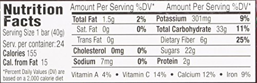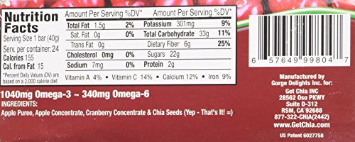 4 TOTAL INGREDIENTS PER BAR - 3 are all natural/real fruit and the 4th is chia seeds - That's it! Vegan ~ Kosher & Gluten-Free Taste GREAT! 2 full servings of fruit per bar Low-Glycemic with the natural sugar of 1 fresh apple NO added ingredients, nothing artificial & no preservatives, period!