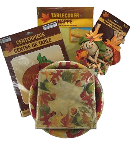 This 5 piece thanksgiving bundle pack includes a beautiful fall tablecloth with leaf design and matching plates and napkins. It also includes a ruffle paper pumpkin centerpiece and 2 scarecrow picks perfect for any flower arrangement or decoration.
