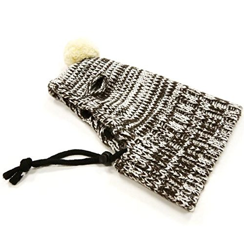 Brown Medium. Dogo designer dog beanie hat with neck protection. Your dog or cat will be warm and adorable in this winter hat featuring browns and cream coloring. Facial opening and ear slits, pull down over the pet's head with a neck back for extra warmth around the pet's neck as well. Ears fit through slits on the top of the hat. Facial opening with cinch cord tightening. Pom pom on the top of the hat. Made of 60% wool, 40% acrylic. May be hand washed, lie flat to dry