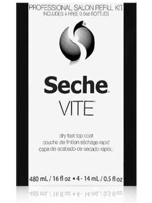 The Seche Vite Dry Fast Top Coat Refill Kit includes a 16 oz refill and four 0.50 oz bottles, providing a quick-drying, crystal-clear finish that enhances the durability of your manicure. This award-winning, cruelty-free formula is designed for easy application and long-lasting results, making it a favorite among nail professionals and enthusiasts alike.