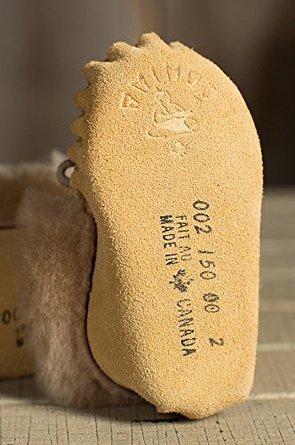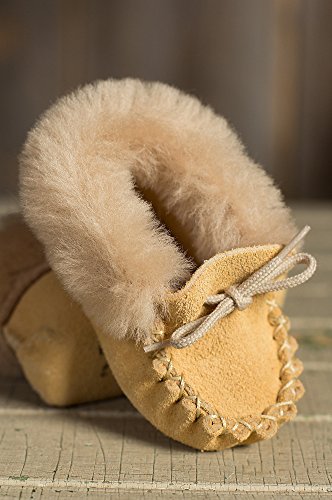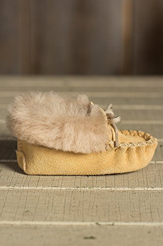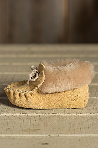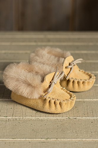 Fashioned in the tradition of the earliest moccasins worn by native North Americans, these soft suede moccasin booties make precious little feet cozy and happy. Crafted from South American split suede, these tiny booties feature a matching tie cord through the collar that's adorned in soft shearling wool for a cozy slipper worth wearing. These adorable mocs make the perfect protection for tender little tootsies. And an irresistible gift. Made in Canada.