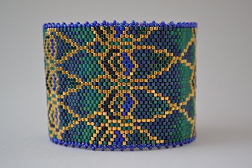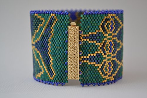 Created to look like peacock feathers this bracelet is stitched in peyote using Miyuki delicas. The beautiful color combination includes blueberry wine, cobalt, green, blue, blue/green, and 24 karat gold plated. The edges of the bracelet are finished with picot in cobalt. The slide clasp is 24 karat gold plated with a basket weave design. The bracelet is one and 3/4 inches wide. Including the clasp the length is 7 and 1/8 inches long. Design credit goes to The Bead Loom Gallery.