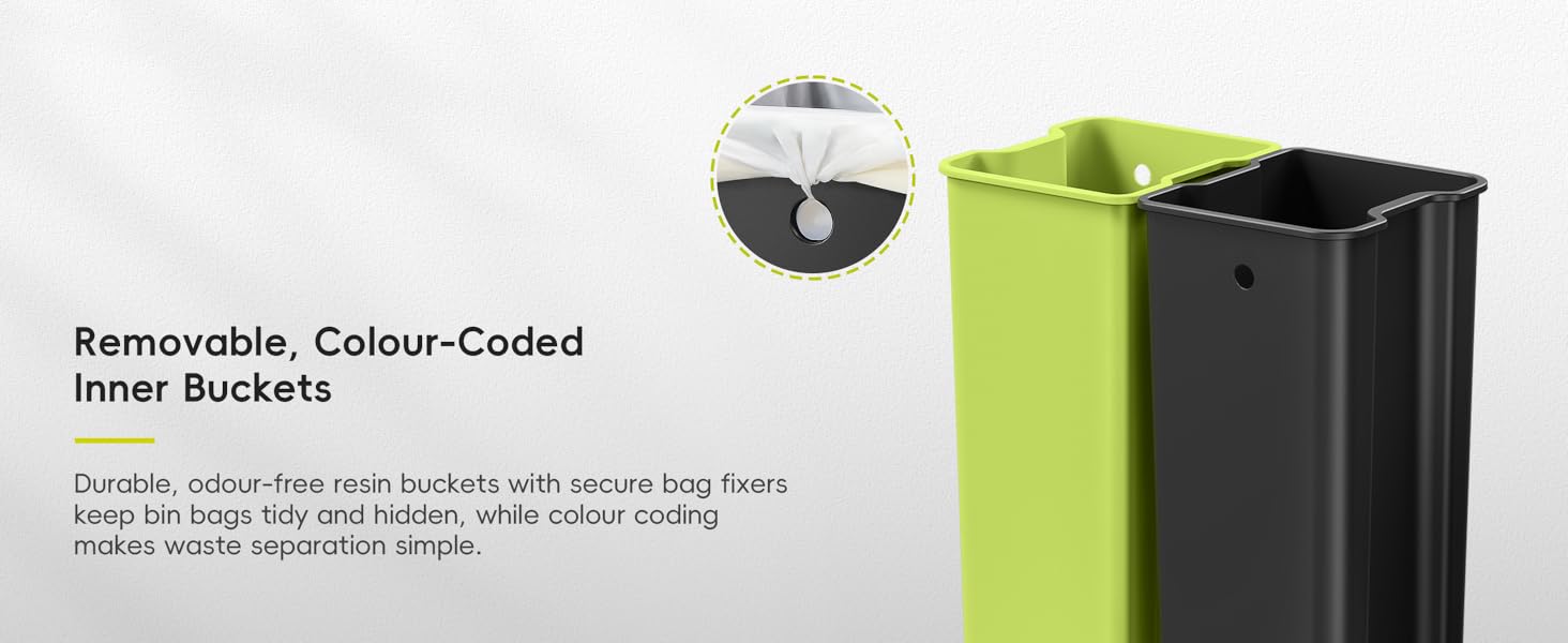 The Mirage X 40L Automatic Sensor Kitchen Bin features dual 20L removable compartments for easy recycling, a rapid 0.2-second motion sensor for touchless operation, and a fingerprint-proof brushed stainless steel exterior. Its whisper-quiet soft-close lid and up to 8 months of battery life make it a durable, hygienic, and stylish addition to any modern kitchen or office.