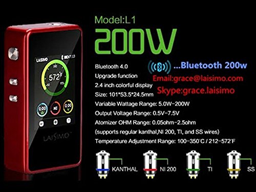 L1 200W Bluetooth 4.0 Size: 101 x 53.5 x 24.5mm Output Voltage: 0.5V-7.5V Input Voltage: 6.2V - 8.4V Output Power: 5W - 200W Mode Choice: Kanthal Mode, Ni200 Mode, Ti Mode, SS Mode Atomizer Resistance Range: 0.05 Ohm - 2.5 Ohm Temperature Adjustment Range: 100C - 300C / 212F - 572F