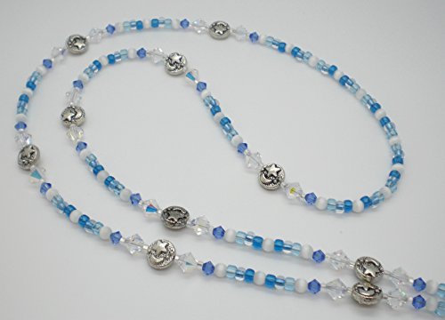 Beaded lanyard is made with 9mm Antiqued Silver Moon / Star Beads, 6mm Swarovski Crystal AB Bicones, 4mm Swarovski Crystal Sapphire Bicones, 4mm White Cat's Eye Fiber Optic Beads, 6/0 Glass Seed Beads in Aqua, Turquoise Blue, Metallic Blue-lined Clear, 11/0 Glass Seed Beads in Silver-Lined Clear....Steel split key ring is in a teardrop shape in a gunmetal finish.