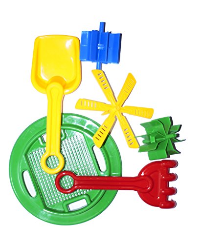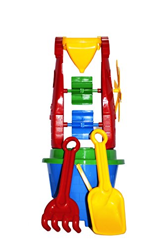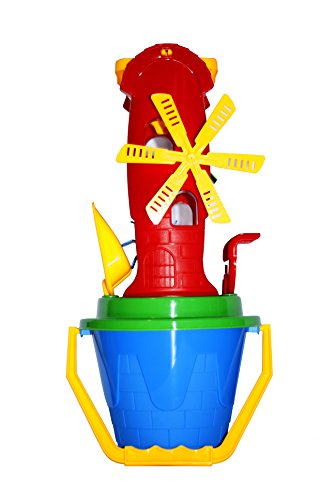 The Windmill toy set will make your children's beach time really fun! It includes the windmill with two wheels inside and the funnel, big wind wheel, big bucket, the shovel, the rake and the sieve. Children can create sand castle forms using the bucket. Pour the sand into the funnel and watch the sand move both wheels! Use all the tools altogether to have sand fun. All edges and corners are smooth.