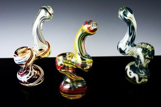 Mini color changing sherlock glass bubbler with stripe accents. Colors will vary. Approximate size: 5" Approximate weight: 65g