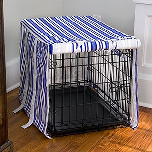 Turn your metal dog crate into a comfortable, stylish bedroom for your dog with this blue and white striped canvas dog crate cover, tastefully coordinated with simple white ties. The cover rolls up to allow a cool breeze in the summer and rolls down to provide warmth in the winter. The 4 zippers on each corner add a finished look. On the inside, use the pockets to tuck the loose ties when not in use!