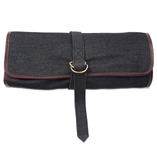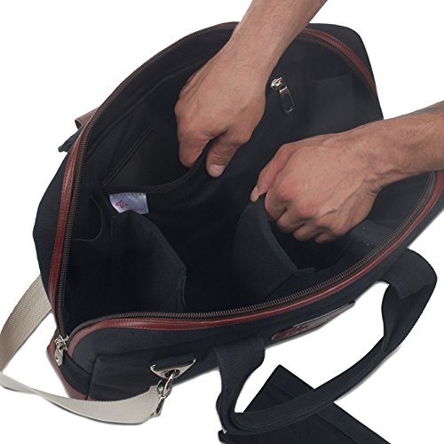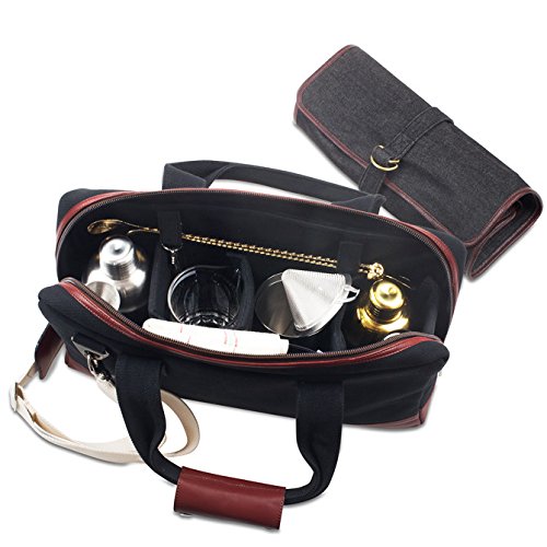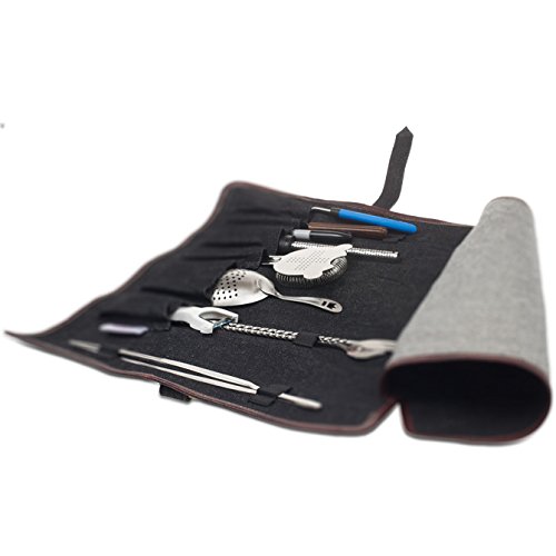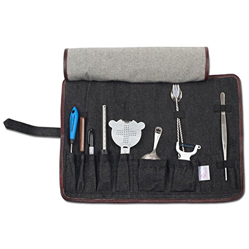 Mixology BagThe Boldric Mixology Bag is a perfect carryall for the on-the-go professional bartender. The handmade canvas and leather trim bag has plenty of room for storing your cocktail shakers jiggers and spoons. The interior features three adjustable Velcro storage slots an inside zip pocket and two smaller pockets for jiggers.The exterior features a removable carrying strap and overlapping zipper for use with a travel lock. Each bag also includes a durable 7 pocket denim roll made of rich cotton canvas body and brown leather trim to securely hold smaller bar tools. 18 length x 12 height x 3.5 width. Denim roll: 18 length x 14 width.