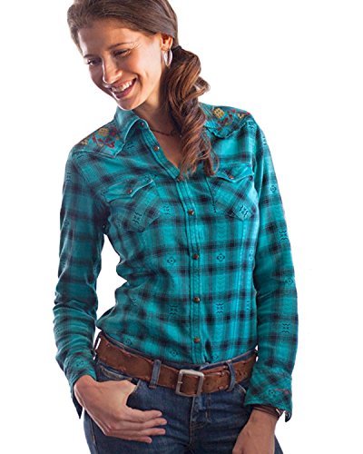 Ryan Michael's Women's Black Hawk plaid shirt is the perfect combination of style and comfort. The Aztec embroidery details and hex wood snaps, make it more than just another plaid shirt. A great look with a pair of jeans for a casual night out. Like a lively story spun around a campfire, Ryan Michael's garments are colorful, rooted in history, have surprising details, and create a lasting impression. This is clothing that speaks for itself, like you prefer to do.