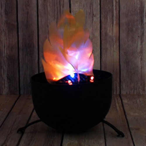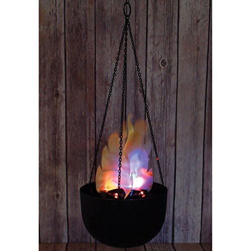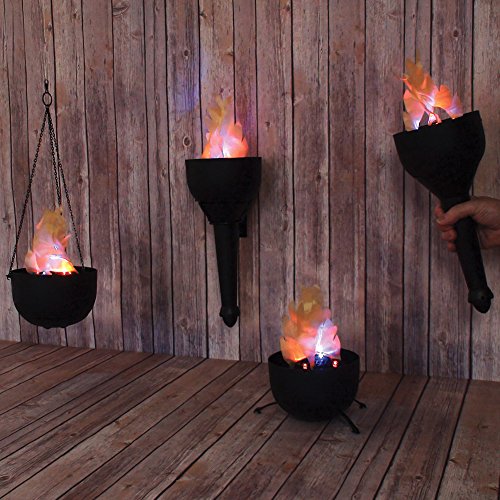 Four In One Burning TorchInstantly add a fiery glow to any atmosphere--without the actual fire!Charming light features colored LEDs, "flame" silks, and built-in fan to mimic a burning torch or fiery cauldron.Includes 6" dia. x 5"H cauldron with 3 fold-out legs, 12"L 3-chain assembly with ring, 10"L handle, and mounting hardware. Great for use in a haunted house, at parties, or as a fun accent for nighttime gatherings.Uses 4 C batteries or 6-volt DC power adapter, not included.WARNING: Choking Hazard - small parts. Not for children under 3 yrs.