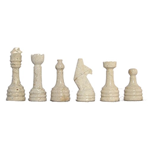 These Rustic Style hand-made marble chess pieces are ideal for collectors and chess enthusiasts that want something unique, but still in a traditional style that makes play easy. Each piece is hand carved, so no two sets of Chess Pieces are ever exactly alike. These marble pieces should be left out on display when possible! Marble Chess Pieces are very fragile and should be handled with care. King Height: 3 1/2" King Weight: 2.6 oz King Base: 1 1/4" Recommended Square Size: 1 3/4" - 2"