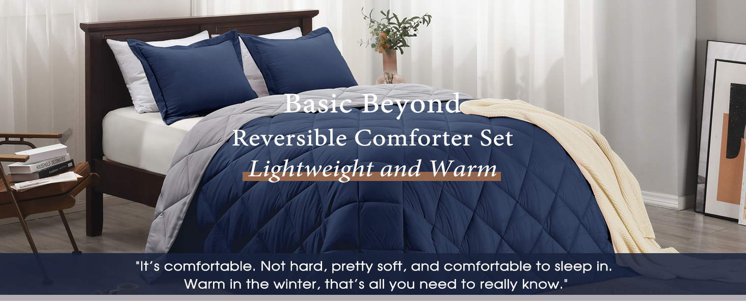 The Basic Beyond Queen Comforter Set offers a stylish, reversible navy and grey design crafted from soft 100% microfiber with durable synthetic fill. Sized generously at 88"x92", it includes two matching pillow shams and is fully machine washable, making it a practical yet elegant bedding upgrade for all seasons.