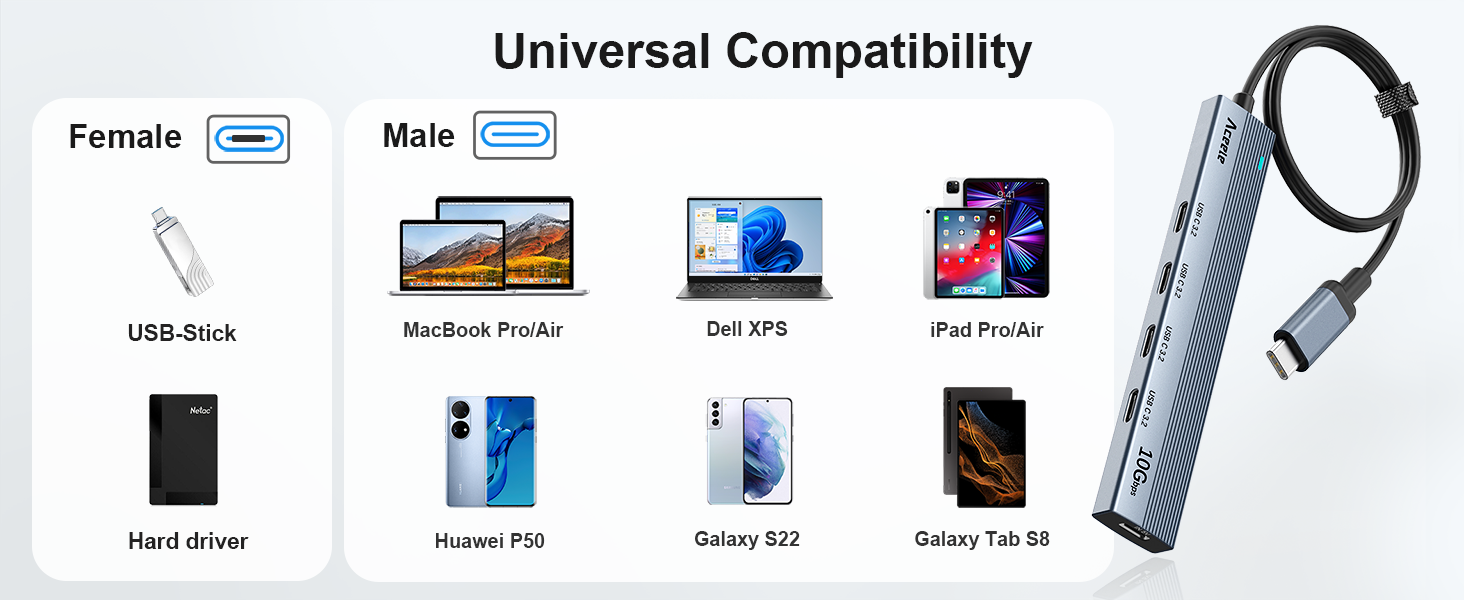 The Aceele USB C Hub is a compact, high-performance 4-port USB 3.2 Gen 2 hub delivering blazing 10Gbps data transfer speeds. Featuring a stable 5V 3A power port and a 2-foot extension cable, it’s designed for seamless multi-device connectivity with MacBook Pro, Chromebook, and other USB-C laptops. Its lightweight aluminum build ensures durability and heat dissipation, making it the perfect portable solution for professionals on the go.