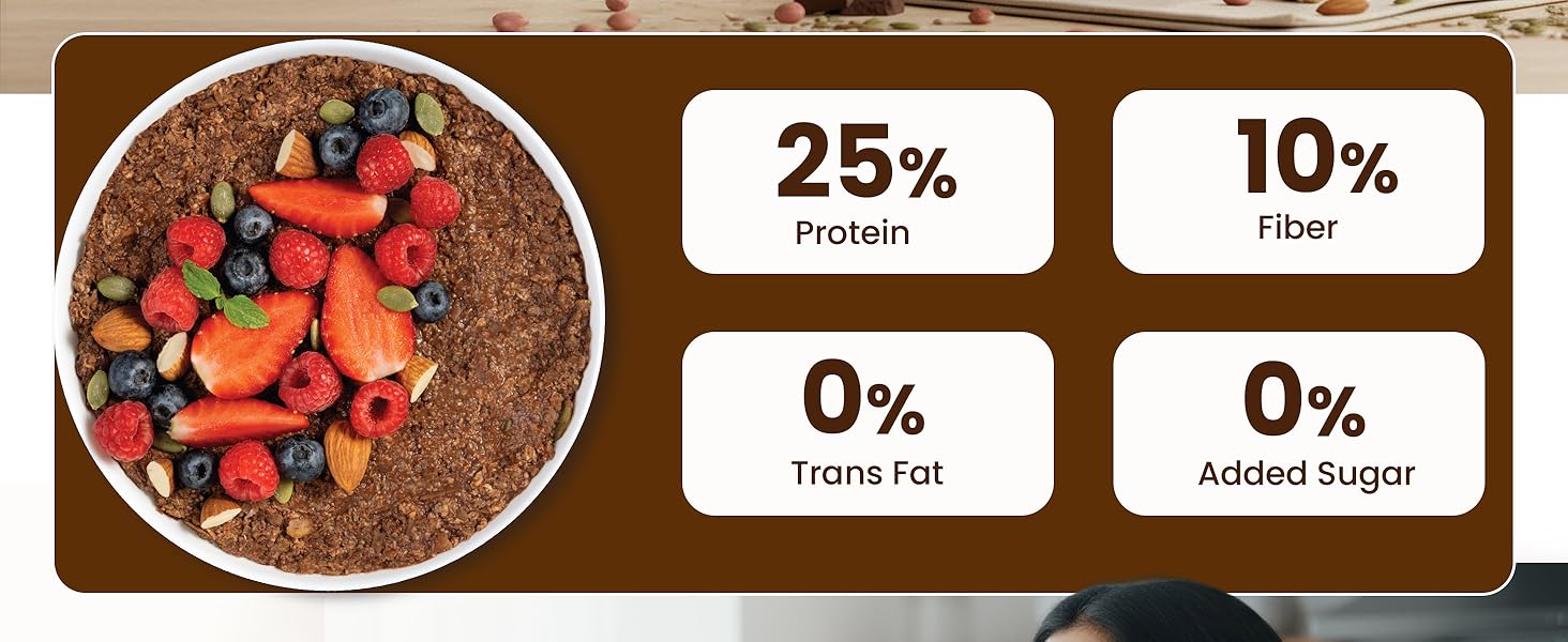 | Ingredients | Oats (43%), Protein Blend (26%) {Texturized Soy Protein, Soy Protein Isolate, Whey Protein Concentrate}; Dry Fruit, Nut & Seeds (12%) (Raisins, Almonds, Pumpkin Seeds, Chia Seeds}; Organic Jaggery, Cocoa Solids (7%), Jowar Flakes Himalayan Pink Salt. |
