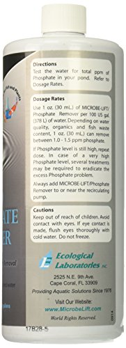 The Ultimate Phosphate Remover For Fresh WaterMicrobe-Lift Phosphate Remover is a polymeric blend with outstanding qualities, including the ability to tie-up large quantities of phosphate without negatively influencing the pond water in any way. Phosphate-caused by the decomposition of organic substances such as food surpluses, dead plant matter and excretion-is only harmless in concentrations below 0.3 ppm in fresh water.Will not harm fish or plantsSafely removes phosphate from pond water