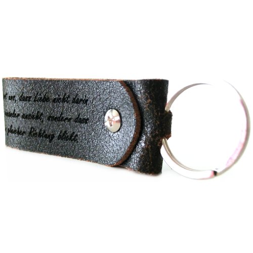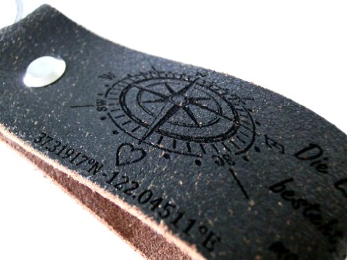 AREA17® Key chains made of real leather with Personalized text engraving - COORDINATES OF THE HEART - Key chain made of cowhide leather. Personalized engraving is free when you buy this key chain with key ring. The key chain is the ideal present for many occasions. Make your keys a visual highlight. Your desired text is engraved onto the chain. Length of the chain: approx. 8cm. Width of the chain: approx. 3cm. + Heart coordinates: Engrave your personal coordinates under the heart of the compass. Where was your first date? Your first kiss? What is dear to you? You can decide for yourself where your heart coordinates should lie. It's so simple... Please send the details for the engraving after placing your order: (for info and choice of font, please see further pictures) 1. Order number/ your name 2. Your desired text (max. 125 characters recommended) 3. Desired font 4. The address of your heart coordinates (country, place with post code, street and, if applicable, house number) We will locate the coordinates for you. You can of course send us your heart coordinates if you have located them yourself. The font of the coordinates cannot be changed. Engraving is as shown.