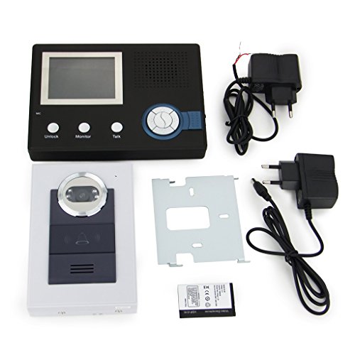 Outdoor Camera: Camera Lens: CMOS 300,000 pixel Diagonal is 120 degrees Viewing Angle is 90 degrees Night View: 6pcs LED light / Infrared Light Material: ABS Plastic +Aluminum alloy Input power: 100-240VAC 50/60HZ Output power: DC 12V; 1A Battery: 3.7V,1000Mah li-battery Power: Standby :0.2W,Unlock:12W Wireless transmitting range: Up to 350 meters in open air Working Temperature: 59F ~ 131F Channels: 64 Net Weight: 140g / 0.3 lb Power consumption: Standby:0.2W Unlock:12W Modulation mode: FHSS Transmission power: 17dBm - Indoor Monitor: Monitor Screen: 3.5 inch color screen Resolution: 320 x 240 Input power: 100-240VAC 50/60HZ Output power: DC 5V; 1A Battery type: 3.7V 1350mAH Li-ion battery Battery charging time: 3 hours (5 hours for 1st time charging) Standby day : 7days Power Consumption: Standby:0.1W,working:2W Modulation model: FHSS Communication: 2.4Ghz Transmission Power: 17dBm Channels available : 64 Memory: Store up to 255 images of visitors Net Weight: 315g / 0.7 lb Dimensions: 185 W x 133 H x30 D mm Package Include: - 1 x CMOS Camera with 2.4 GHz Wireless Transmitter - 1 x 3.5 Inch Screen Monitor with 2.4 GHz Wireless Receiver - 1 x Wall Mounting Bracket for indoor monitor - 1 x 100-240V Power Adaptor for indoor monitor - 1 x 100-240V Power Adaptor for outdoor Camera - 1 x li-ion battery for outdoor camera - 1 x English Version Operation Manual