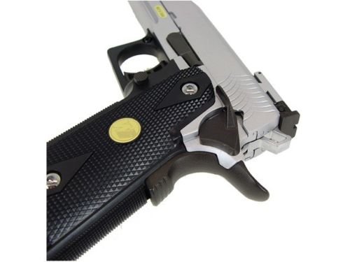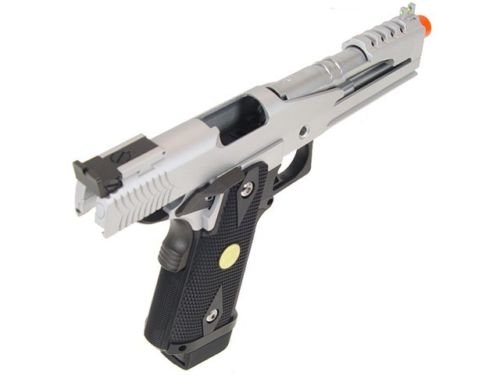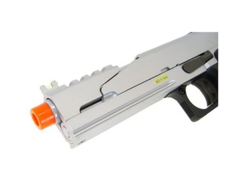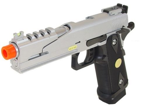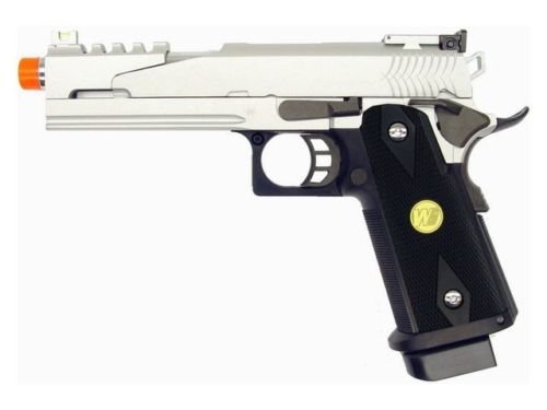 Introducing this very popular High End Gas Powered Airsoft Pistol. This Airsoft Gun has a durable construction design making it a durable and a longlasting airsoft gun. Able to fire in semi automatic firing mode you can go in guns blazing. Even with this fire power you don't need to worry about running out of ammo anytime soon with the 28 round magazine that is included. This awesome airsoft handgun comes with everything you need to get started! So hurry up and get this popular Semi Automatic Gas Powered Airsoft Gun, the ultimate weapon to take into battle! Includes: Instruction Manual, Green Gas Compatible Magazine, and WE Blowback Airsoft Pistol. - Green Gas & CO2 (Green Gas Magazine Included) - Co2 Magazine sold separately Features: 1:1 Full Size Scale, Heavy Weight, Semi Automatic, Railing System, Adjustable Hop-up System, Adjustable Rear Sight, Inner Copper Barrel, Additional Safety Functions (Grip Safety & Hammer Halt), Full Metal Construction, Weight Reduced Slide Design for Faster Action